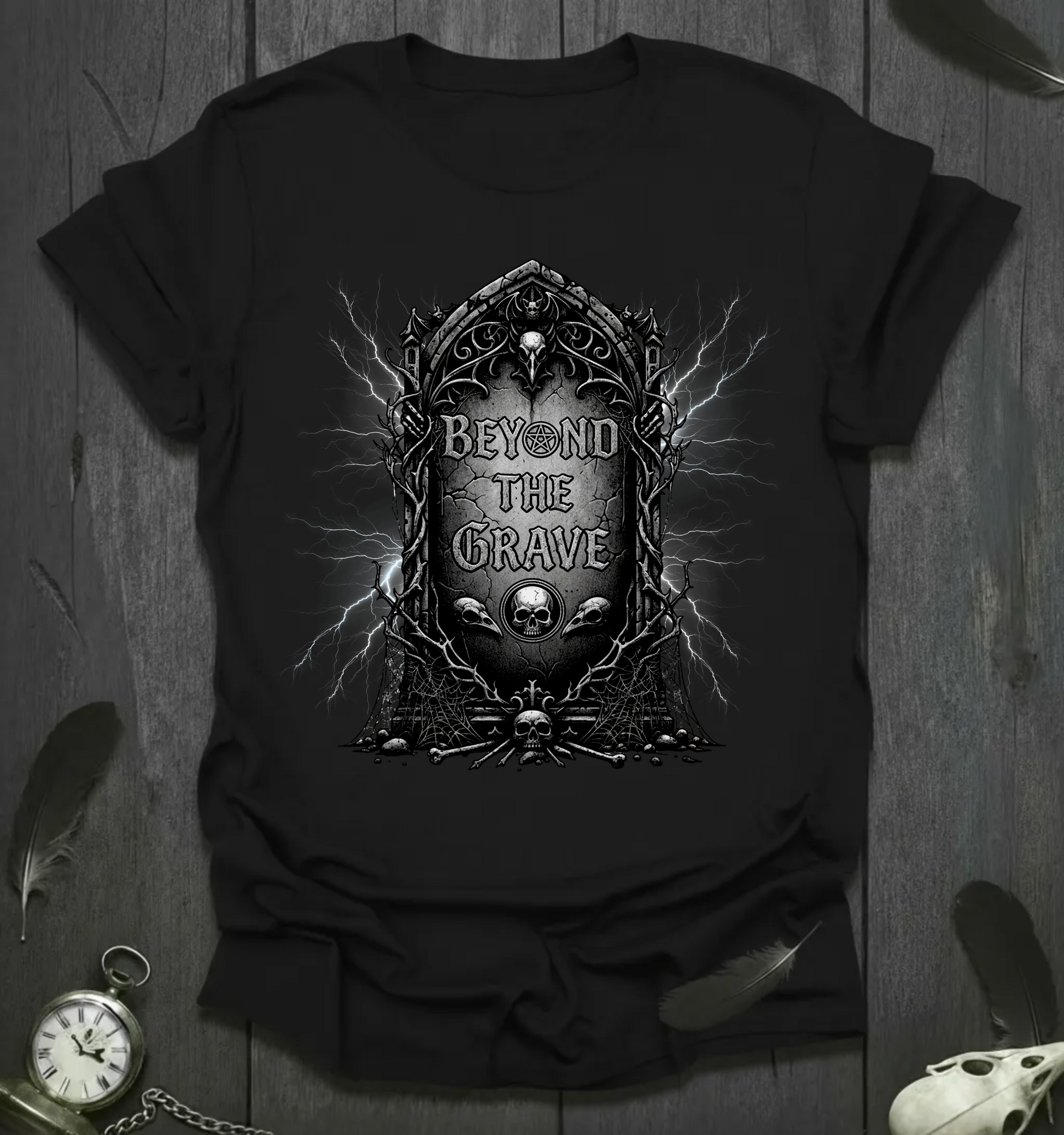 A spooky 'Beyond the Grave' design printed on a unisex softstyle T-Shirt. This T-Shirt gives off a mysterious and eerie vibe, perfect for those who love all things supernatural and dark. Ideal for Halloween, gothic fashion enthusiasts, and fans of horror.