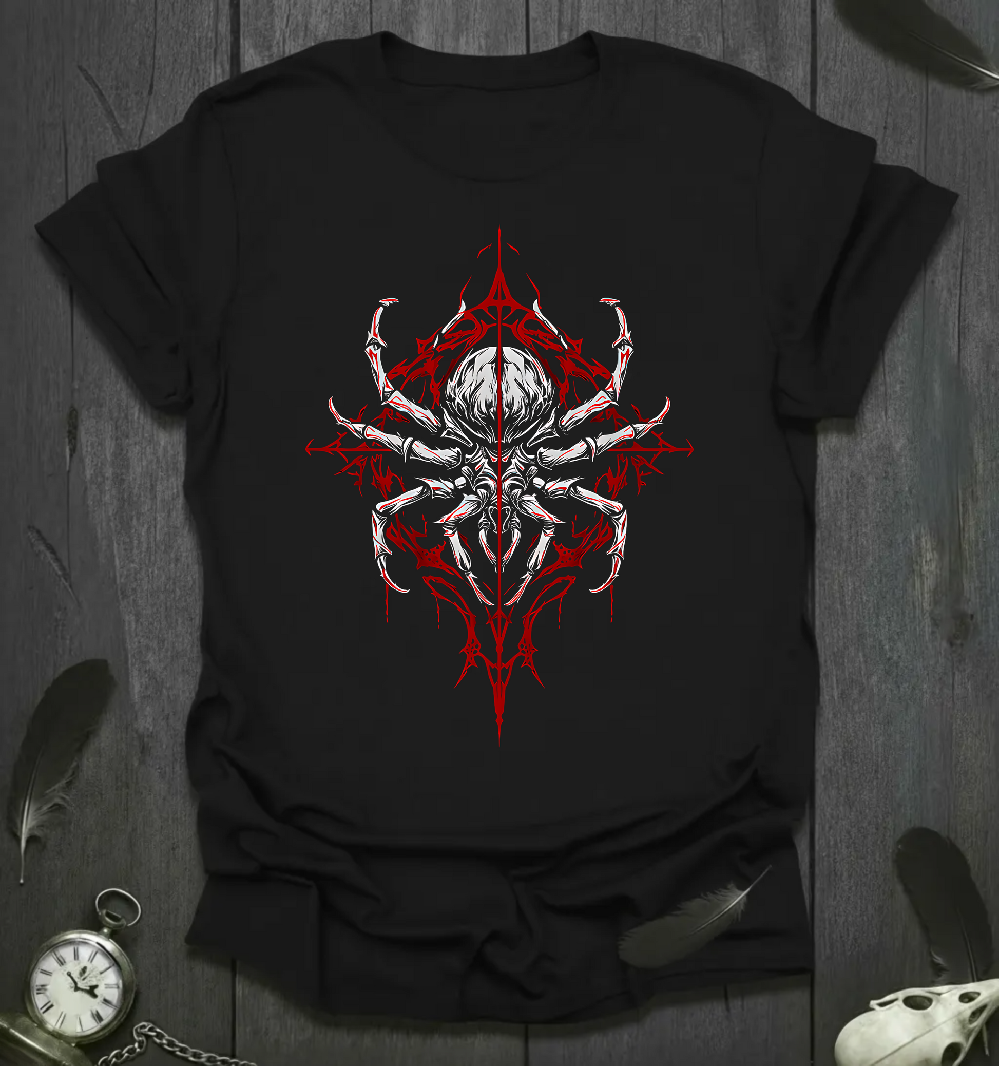 A razor‑symmetrical, blood‑red spider emblem drips like fresh ink, fusing tribal geometry with gothic menace for a striking center print. Spiders symbolize patience, precision, and the power to weave fate, making this piece a banner for creators who turn pressure into design. The motif’s mirrored spikes and web‑born symmetry project cold control and predatory elegance across any black tee or hoodie.