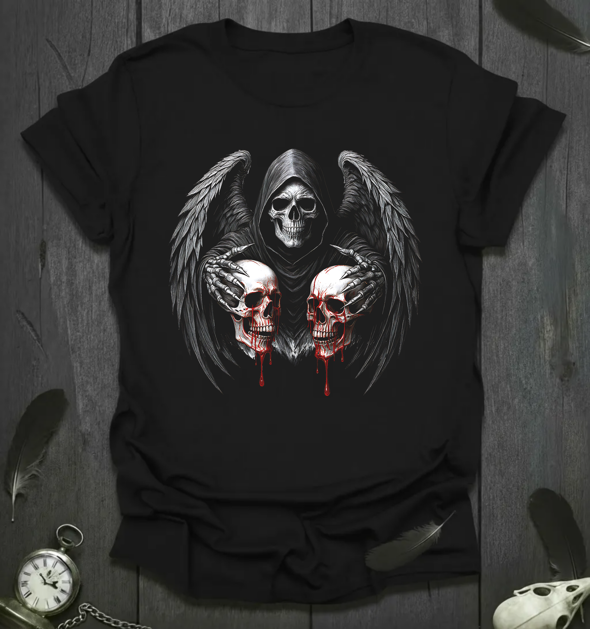 A winged reaper cradles two blood‑dripping skulls like trophies, a stark memento mori that fuses medieval death iconography with modern metal ferocity. The imagery leans into the reaper’s role as the taker of souls while the twin skulls amplify vanitas symbolism-beauty, brutality, and the inevitability of the end in one scene. Throw it on for gigs, night rides, or festival pits when the fit needs funeral‑black drama and stage‑ready contrast that reads hard from crowd to curb.