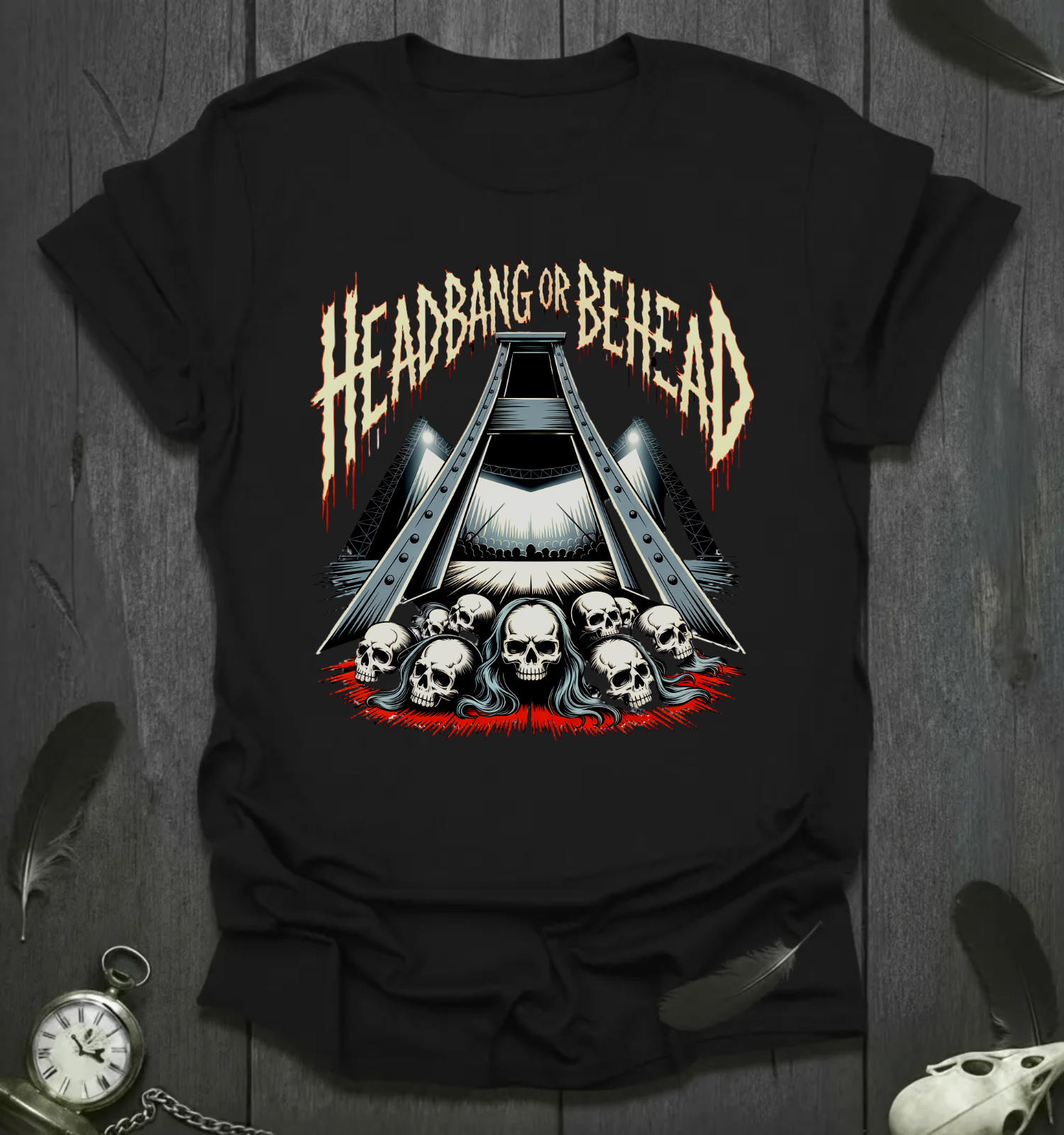 Dripping letters crown a looming guillotine‑styled stage, where floodlights meet a blood‑soaked skull pile-revolutionary menace repurposed for the pit. The imagery riffs on the guillotine’s dual legacy as spectacle and terror, turning crowd energy into a do‑or‑die decree for metal nights. Wear it to festivals and late‑set breakdowns when commitment isn’t optional and the blade might as well be the drop.