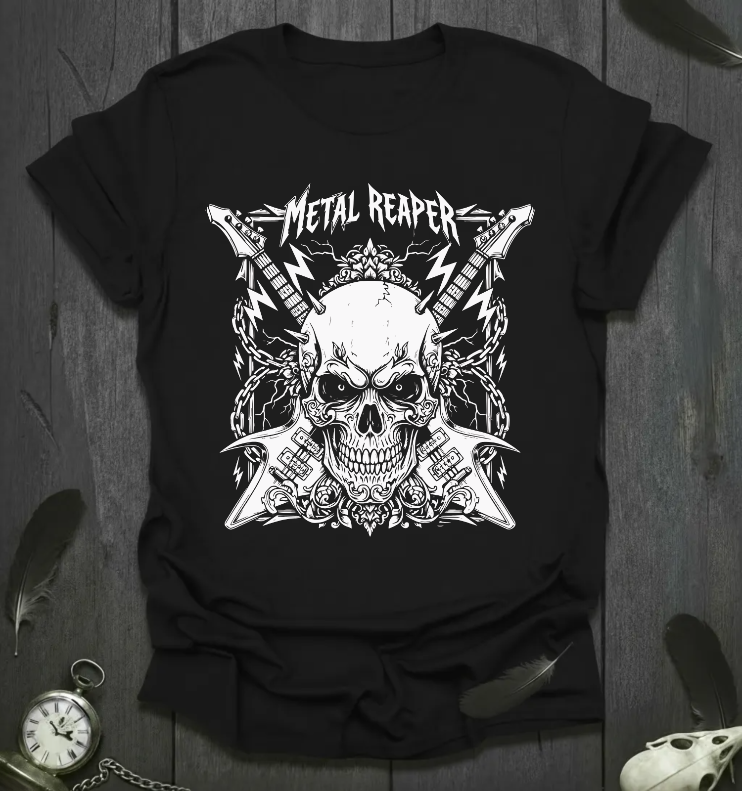 A snarl‑jaw skull crowns crossed V‑guitars, chains, and lightning, forging a shrine to riff warfare in stark black and white. The design channels classic metal iconography-skulls, axes, and electric bolts-into a high‑contrast centerpiece that reads hard from stage to street. Wear it for gigs, rehearsals, and night rides when the set demands relentless downpicks and cemetery‑quiet breaks.