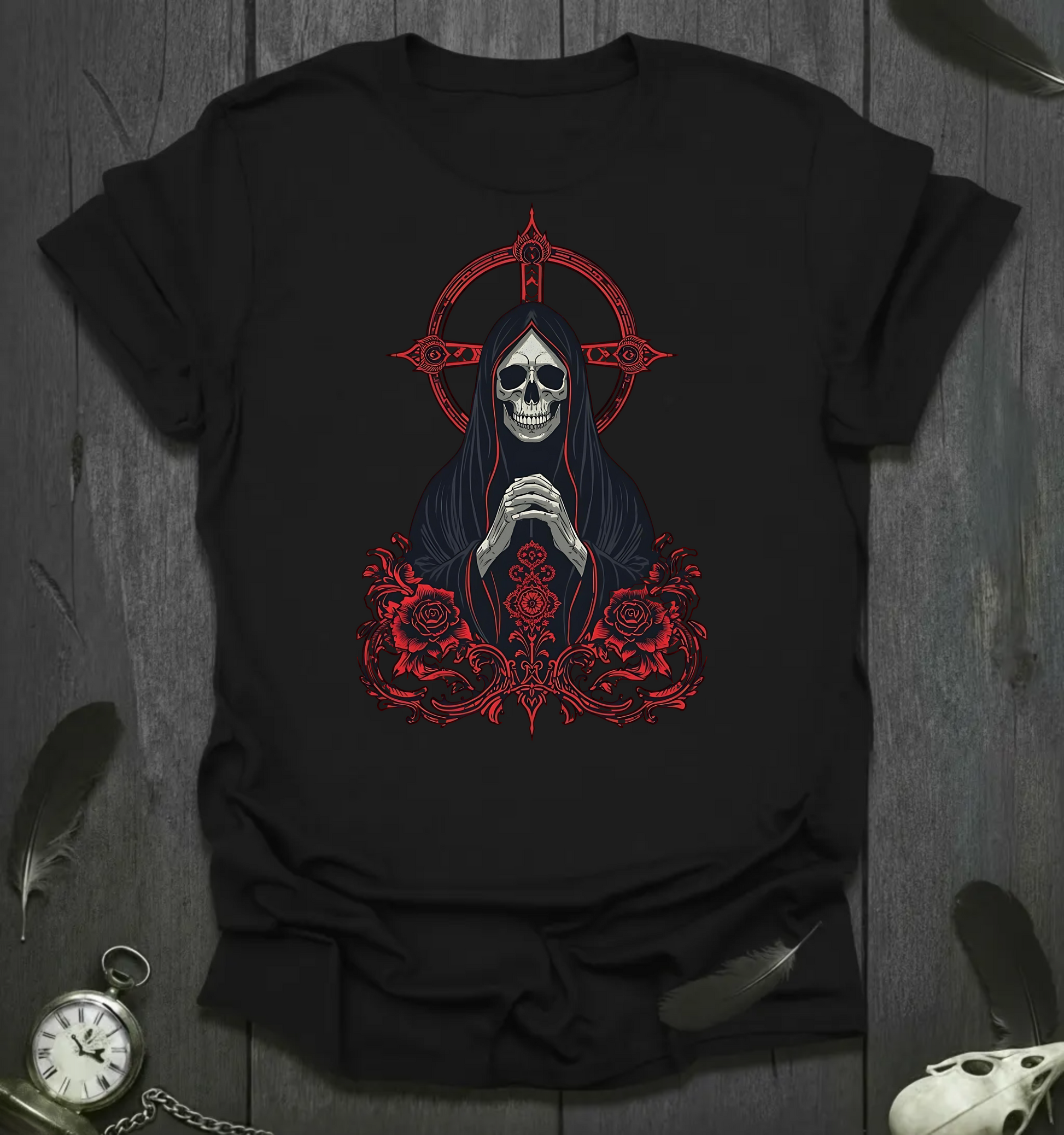 A skeletal Madonna prays within a crimson halo, framed by baroque roses that fuse mourning with beauty-an echo of the Requiem, the Mass for the dead whose very name means rest. The red florals nod to gothic rose symbolism-love, sacrifice, and mortality-while the cloaked skull channels folk‑Catholic death iconography like Santa Muerte’s serene dominion. Wear it for candlelit sets, funerary aesthetics, and October rites when elegance needs a lethal edge.