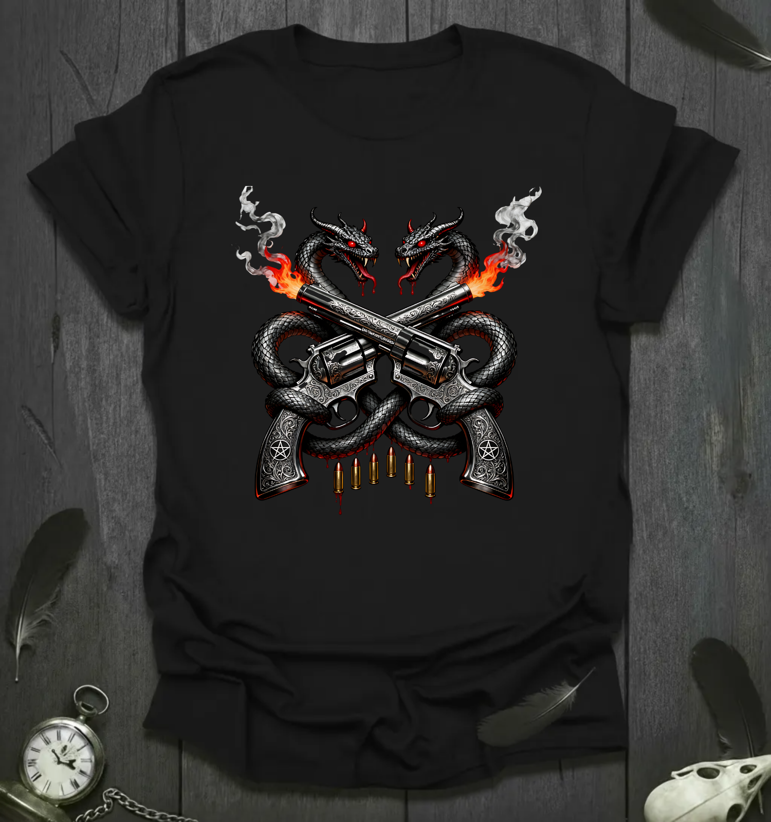 Twin dragons coil around crossed revolvers, muzzles spitting smoke and flame, while spent brass drips beneath-a western war‑badge fused with mythic guardians. The serpents add ancient power and rebirth energy to the outlaw motif, turning a classic crossed‑pistol emblem into a gothic crest that reads hard on black. Wear it for night rides, desert shows, and throttle therapy when the set demands sparks and swagger.