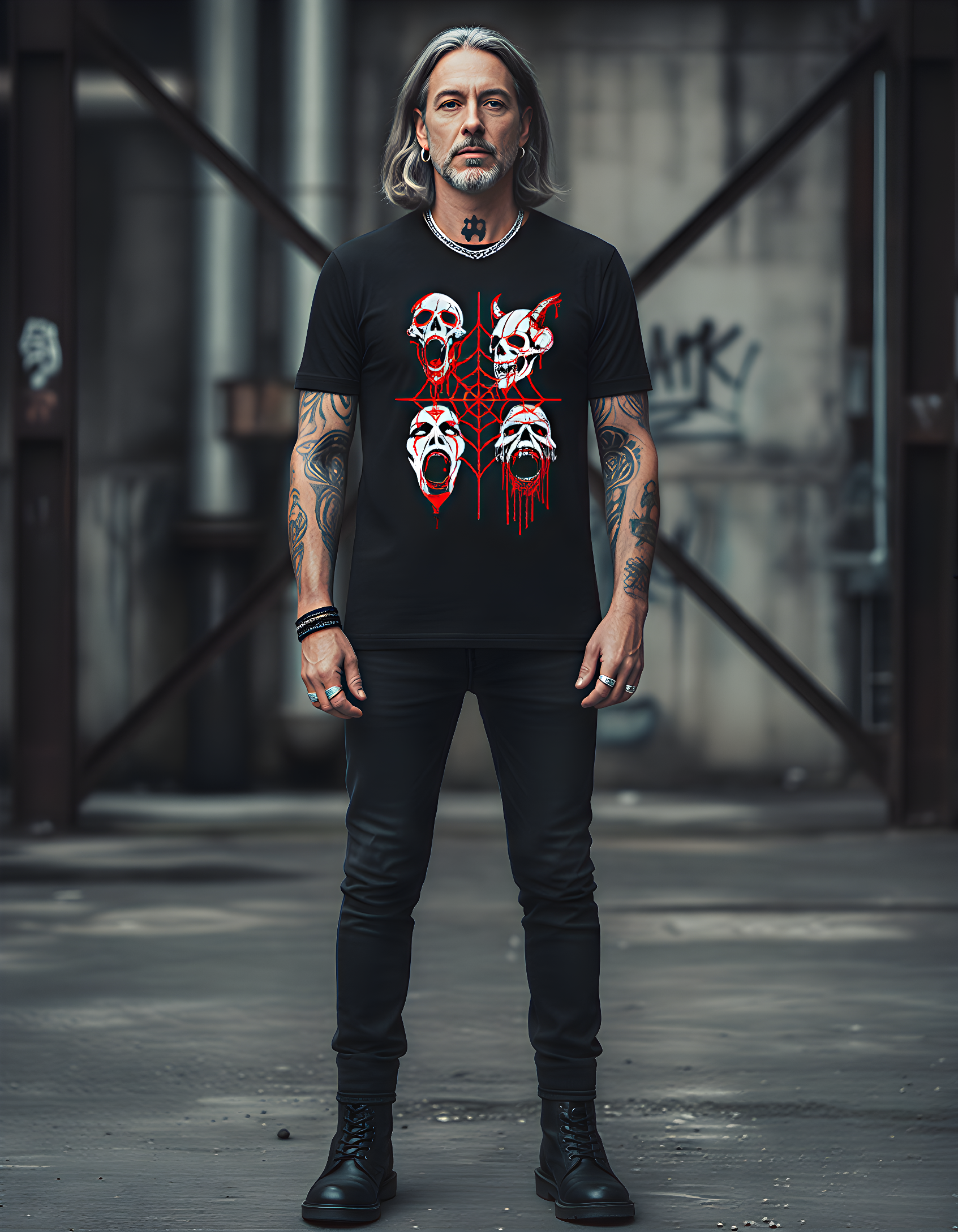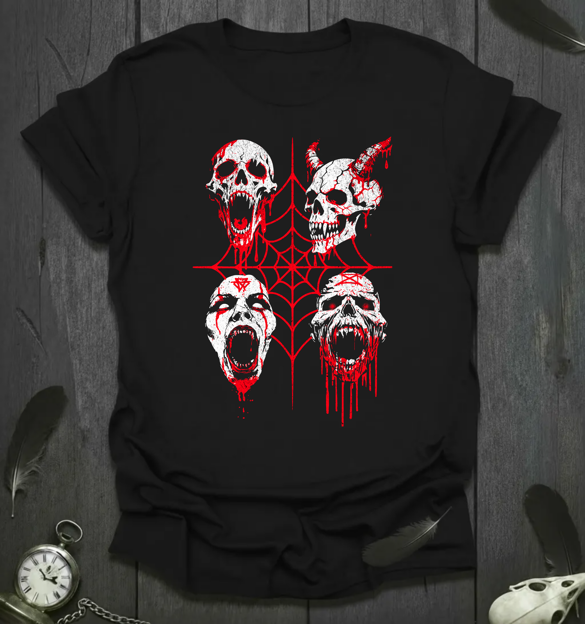 Unleash your dark side with this fearsome tee: four bloodthirsty zombies bursting with raw, supernatural energy in a metal-gothic style. Show the world you’re not afraid to embrace the horror-wear "Unholy Feast" and let your look bite back. This is more than a shirt. It’s a statement.